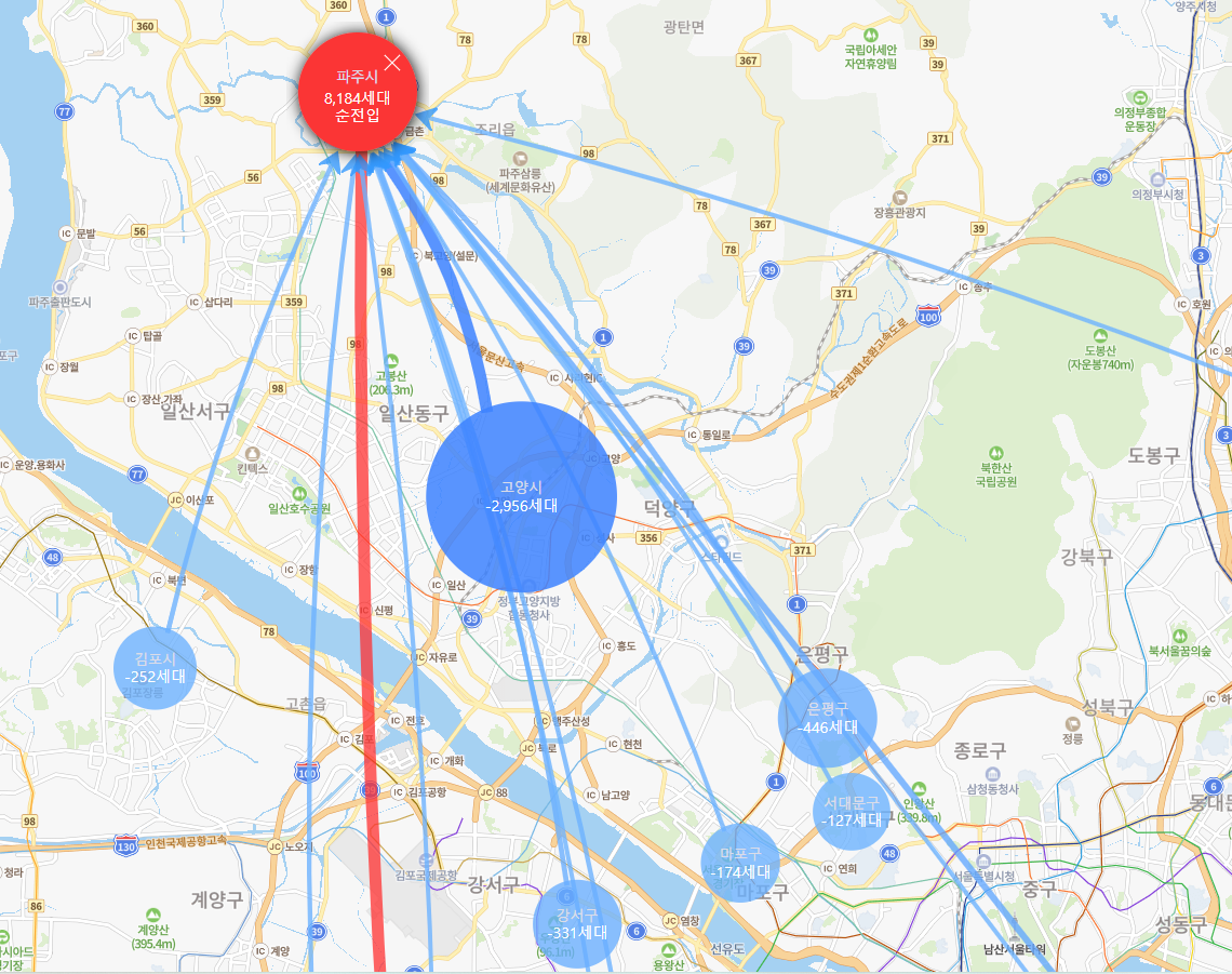 그리고, 작년, 재작년에 교통 호재라고 하면 항상 언급되었던 GTX의 공사가 시작되면서, 운정 신도시와 문산, 파주 출판도시에 인구가 계속 유입될 것으로 예상되어, 인구는 지속 상승할 것으로 보인다. 순전입 세대수가 1년전 대비 어느정도 되는지 호갱노노 사이트에 찾아가서 한번 찾아보았다. 아래 보이는가? 사람들이 파주시로 모이는 데이터가? 이 그림을 보고 놀랬다. 놀라운건 이 세대수 데이터가 끝이 아니다.