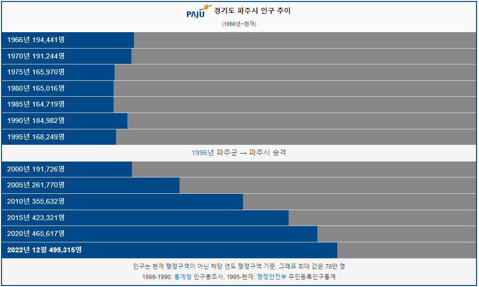 파주시는 1996년 파주군에서 파주시로 승격되었다. 내 기억이 맞다면 2010년 정도에 LG 디스플레이 공장이 들어서면서, 대기업 및 중소기업을 다니는 직장인들이 유입되기 시작했고, LG 디스플레이를 시작으로 LG 이노텍, LG 화학이 현재 들어와 있어서, 일자리는 점점 풍부해지고 있는 상황이다. 그리고, LG 에너지솔루션도 파주에 연구개발센터를 설립한다는 이야기도 있는 상황이라서, 파주의 인구는 지속적으로 늘어날 것으로 예상된다. 그래서 파주시의 인구추이를 조금 찾아보니, 역시나 2005년부터 인구가 가파르게 올라 2005년 대비해서 2022년의 인구수가 거의 2배가 늘어나 있는 상황이되어있다.