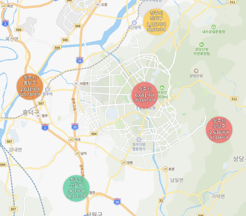 총 인구수나 세대수를 보면 여전히 흥덕구가 사람들이 선호하는 구임을 알 수 있다.