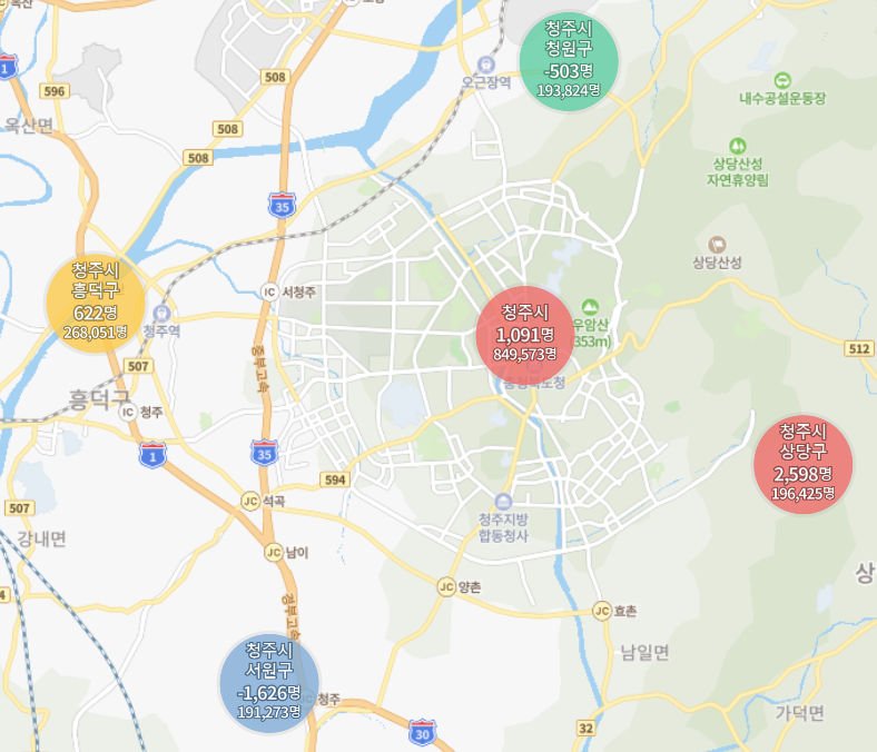 상당구가 제일 높은 숫자를 보여주고 있긴 하지만,